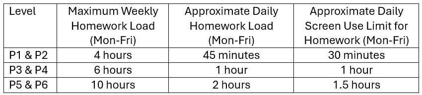 The school is mindful of the well-being of students when assigning homework. For holistic development, students need to have a balanced life with adequate time for family bonding social activities, personal interests and rest. The following